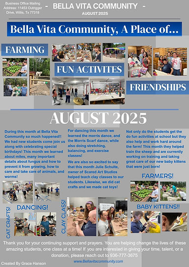 Bella Vita Community is a faith based non-profit founded in 2022. It is located in Conroe Texas, on a beautiful 50 acre ranch. Bella Vita Community helps young adults with intellectual and developmental disabilities advance mentally and physically through farm based science and dance. Now Bella Vita Community is a day-program but soon will be a residential destination.